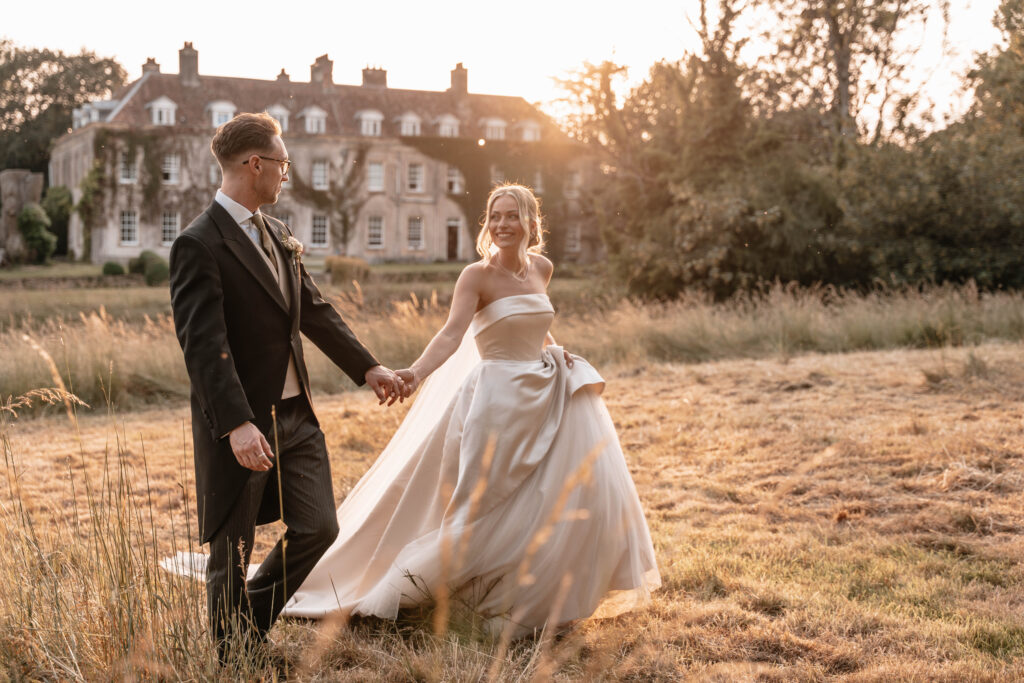 A bride and groom walk hand in hand in a sunlit field in front of Holbrook Manor. She wears a strapless gown and smiles, while he wears a black suit.